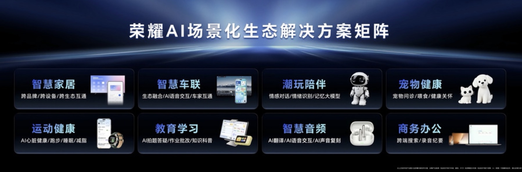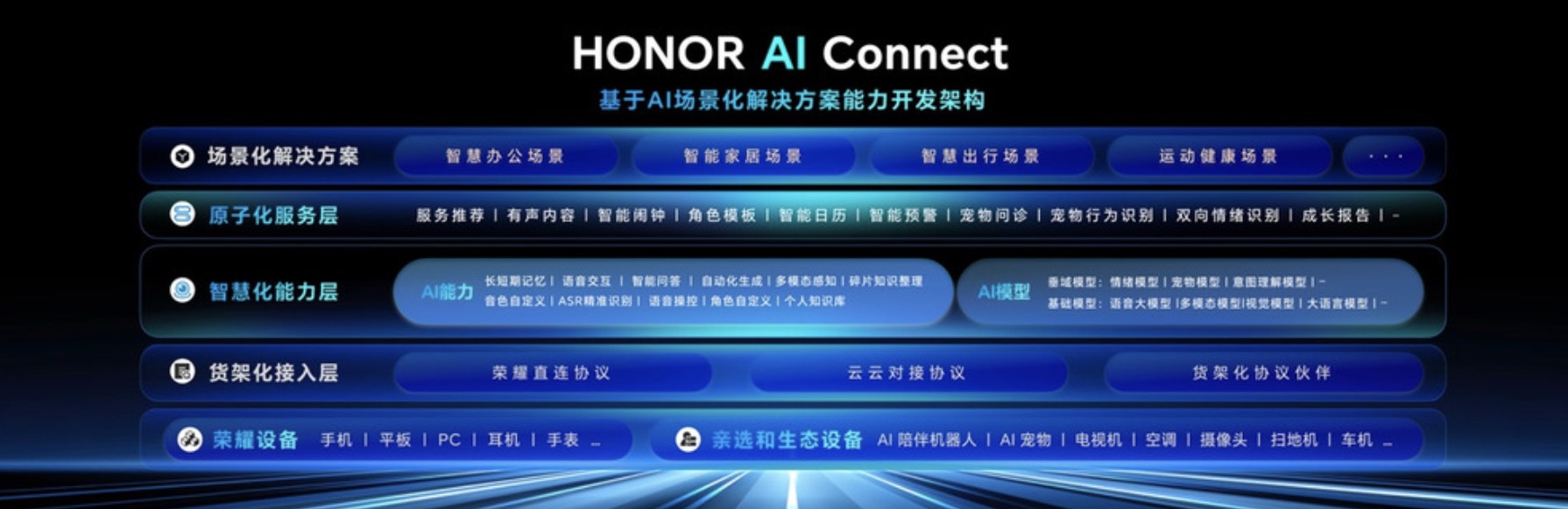 为解决用户面对“场景割裂、服务单一”的智能生态时带来的碎片化体验,并攻克行业长期存在的互联互通难题,荣耀基于HONOR AI Connect平台,发布了8大AI场景化生态解决方案,覆盖智慧家居、智慧车联、潮玩陪伴、宠物健康、运动健康、教育学习、智慧音频、商务办公等场景。此次发布的8大AI场景化生态解决方案深度融合软硬件能力,是荣耀构建AI生态的核心引擎。荣耀将把这些解决方案全面向行业开放,携手合作伙伴共同推进更多AI垂直领域的生态共创,打造一个繁荣、开放、持续进化的AI终端生态,全面构建以人为中心的智能生活闭环。