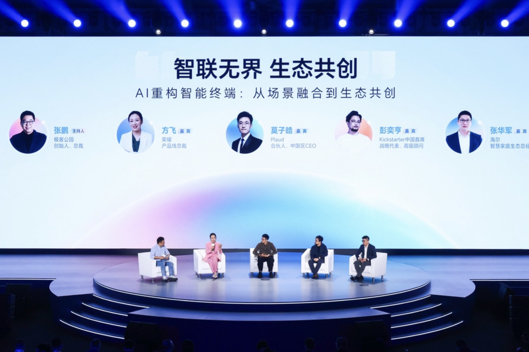 在大会主论坛,紧随AI生态战略与“HONOR AI Connect”平台发布之后,一场以 “AI重构智能终端:从场景融合到生态共创” 为主题的圆桌讨论亦如期举行。荣耀产品线总裁方飞、海尔智慧家庭负责人张华军、AI新锐公司Plaud合伙人、中国区CEO莫子皓以及全球众筹平台Kickstarter的彭奕亨,在极客公园创始人张鹏的主持下,从终端、家居、AI硬件及全球视角,共同探讨AI终端生态的未来发展路径。