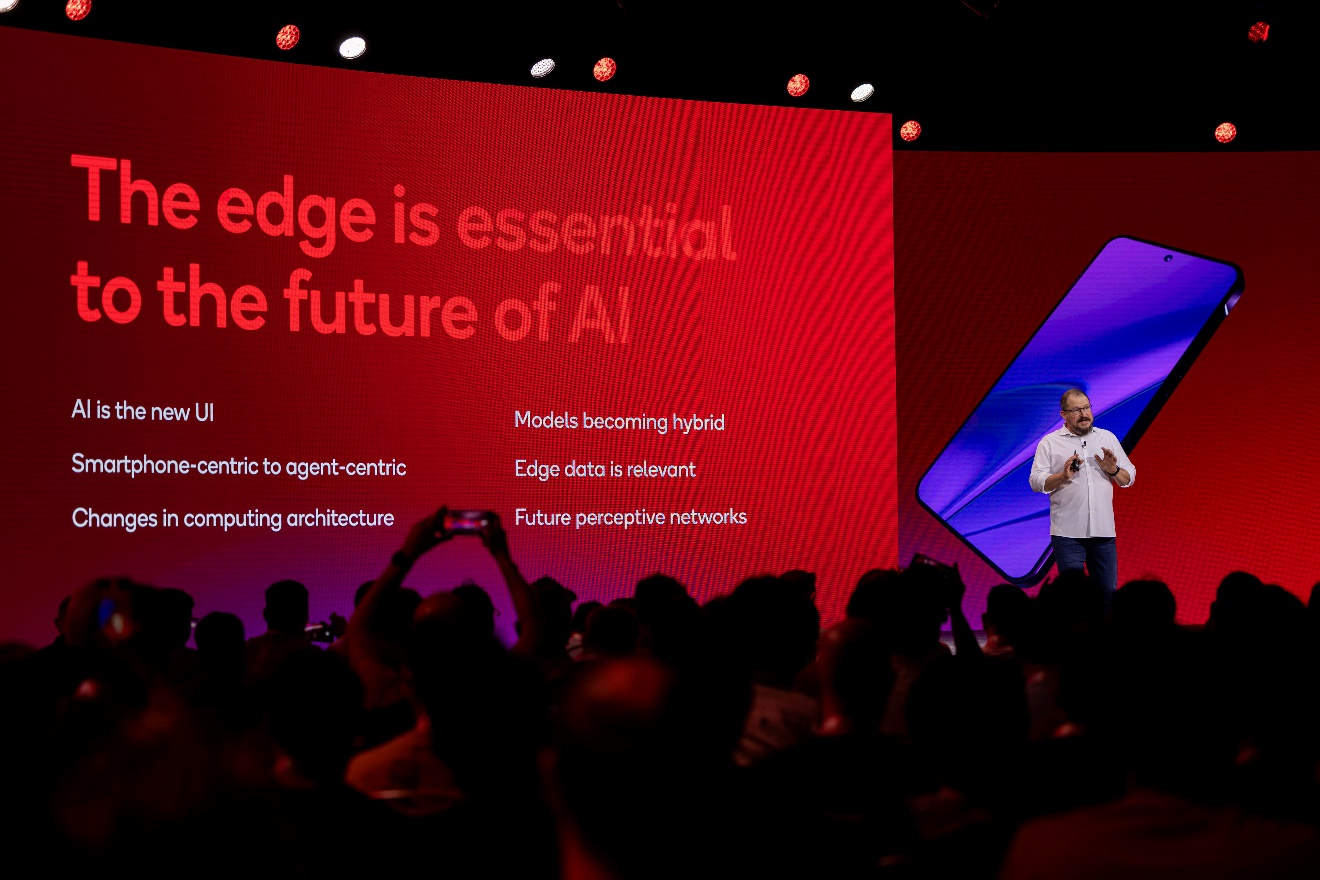 在此基础上,高通公司总裁兼CEO安蒙更从战略层面阐释了AI未来的发展方向与高通的核心目标:六大趋势正在驱动AI未来的发展——AI是新的UI(用户界面),从以智能手机为中心转向以智能体为中心,计算架构迎来变革,模型混合化发展,边缘数据相关性增强,迈向未来感知网络。