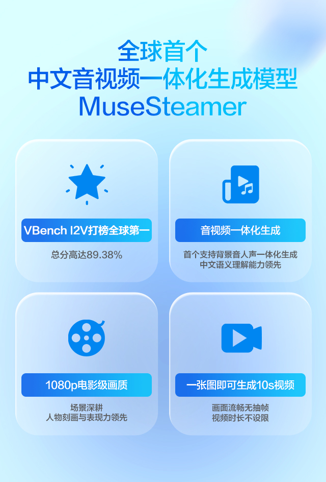 据悉,MuseSteamer具备多项技术突破:在权威榜单VBench I2V中以89.38%总分登顶全球第一,支持一张图生成10秒1080P电影级画质视频,人物微表情与运镜效果达专业影视水准。其核心能力源于亿级中文多模态数据清洗、精细化视频结构化描述语言,以及多目标强化学习等技术优化。