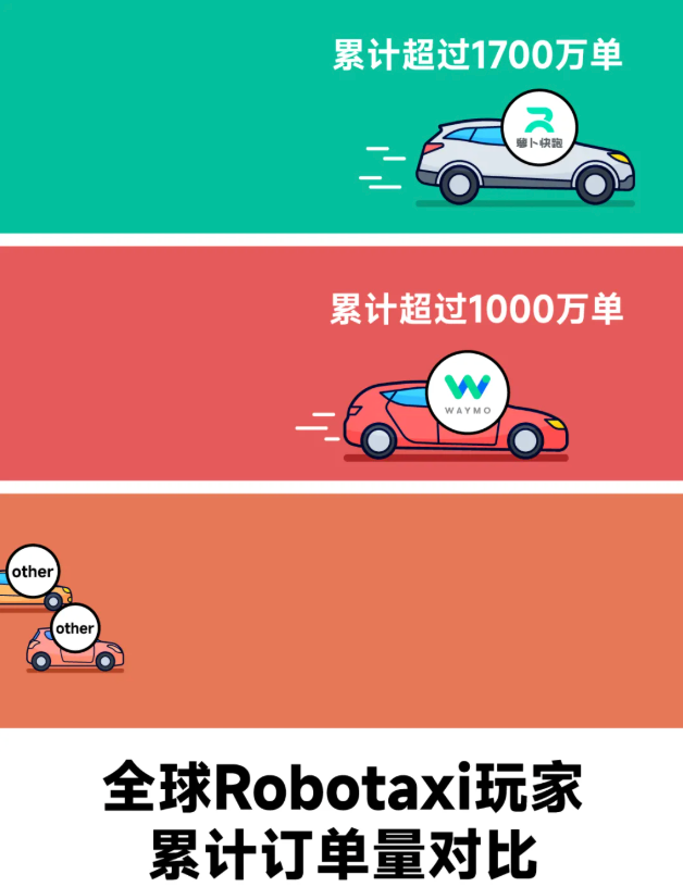 从累计订单量来看,萝卜快跑目前累计超过1700万单,高于Waymo的1000万单。