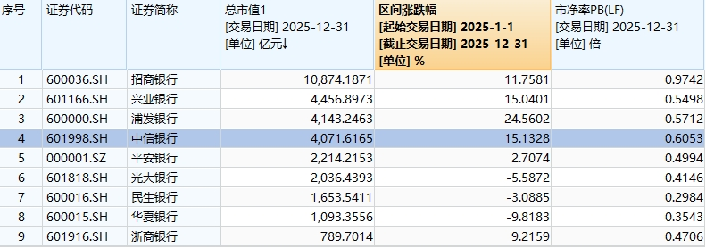 资本充足率改善的过程中股价也持续走好,2025年中信银行A股股价涨幅15%,A股股份行里涨幅仅次于浦发银行,0.6倍的PB仅次于招商银行。
