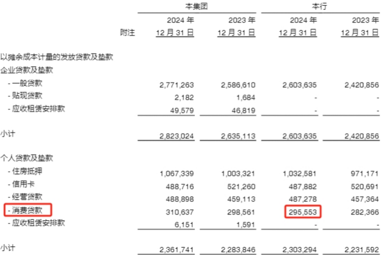 个人信贷业务的三个主要品类——按揭贷款、个人经营贷、个人消费贷,拖后腿的是个人消费贷。中信银行半年报、年报详细披露了按揭贷款、个人经营贷的增量和增速,较少披露个人消费贷的增速,2025年半年报只披露个人消费贷余额是2720亿元。考虑到2024年、2025年上半年中信银行个人信贷总额正增长,按揭贷款、个人经营贷也是正增长,那么个人消费贷增速相对较低。