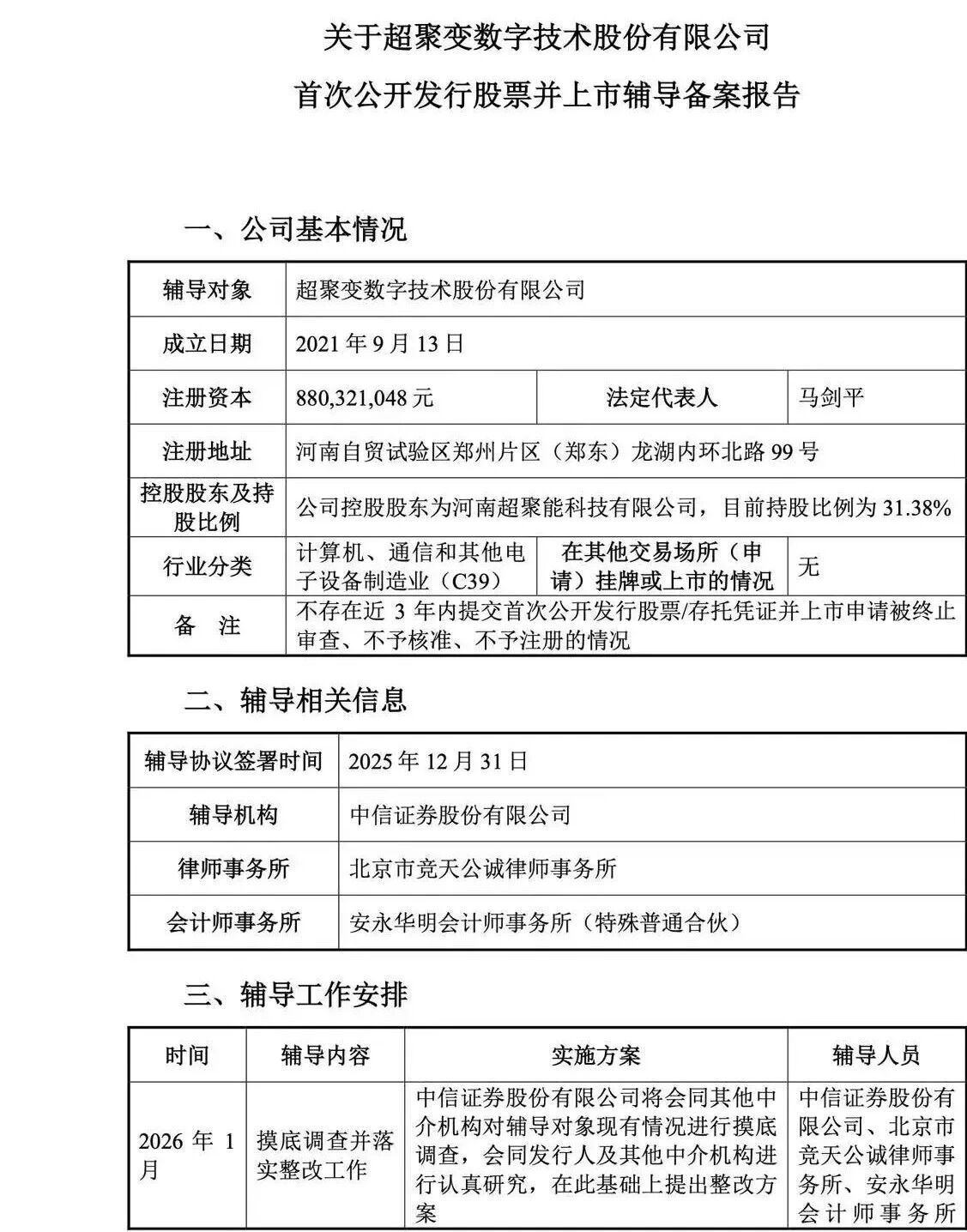【另镜网】近日,证监会网站显示,超聚变数字技术股份有限公司IPO于1月6日辅导备案,辅导机构为中信证券股份有限公司。