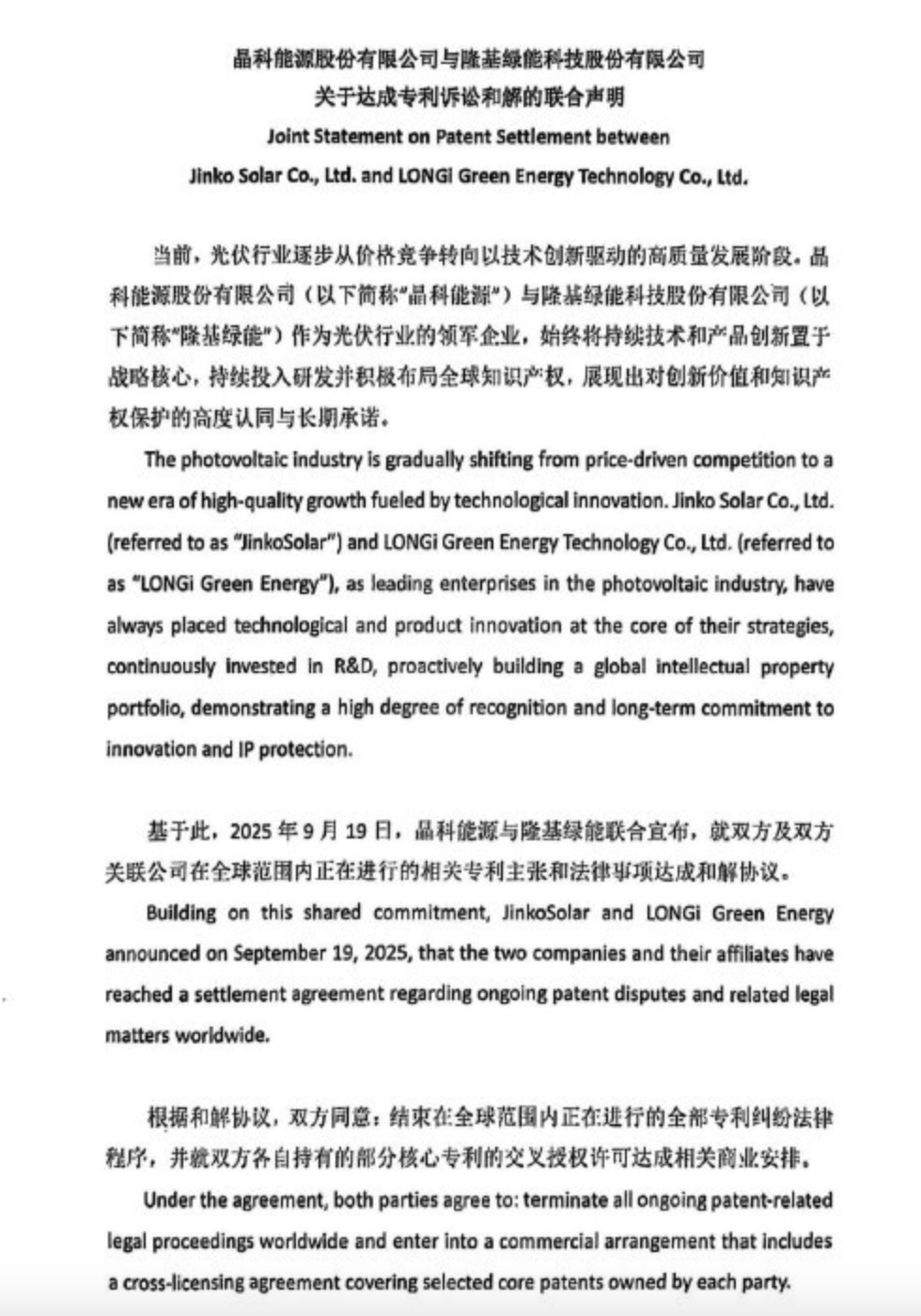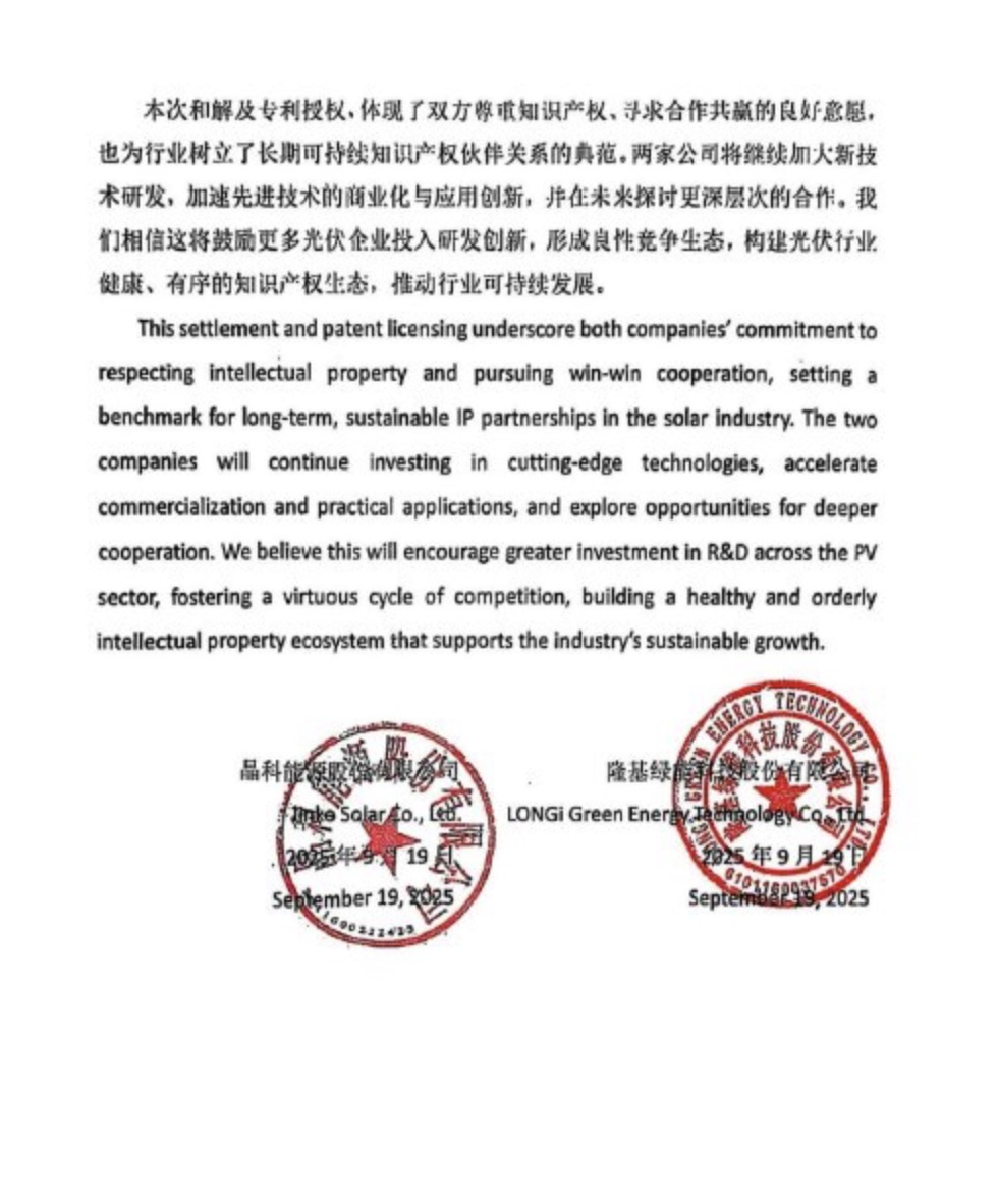 【另镜网】据晶科能源官方公众号消息,2025年9月19日,晶科能源与隆基绿能联合宣布,就双方及双方关联公司在全球范围内正进行的相关专利主张和法律事项达成和解协议。