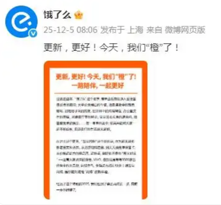 【另镜网】12月5日,中国本地生活服务领域迎来标志性变革,运营了18年的“饿了么”官方突然宣布,APP更新至最新版本后全面焕新为“淘宝闪购”,品牌标识从标志性蓝色切换为淘宝橙色,底部仅保留“饿了么”小字标识。