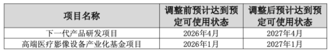 2025年12月中旬,公司宣布将两大核心募投项目——“下一代产品研发项目”与“高端医疗影像设备产业化基金项目”的达成时间双双推迟一年至2027年。