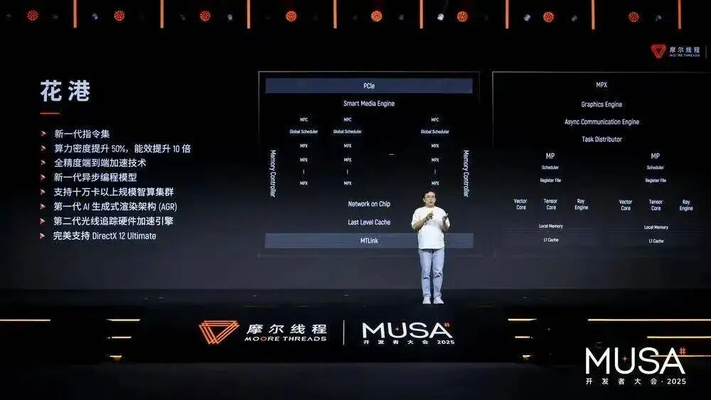 基于MUSA统一体系,摩尔线程揭晓新一代全功能GPU架构“花港”。该架构在计算密度、能效、精度支持、互联能力及图形技术等方面实现全面突破。