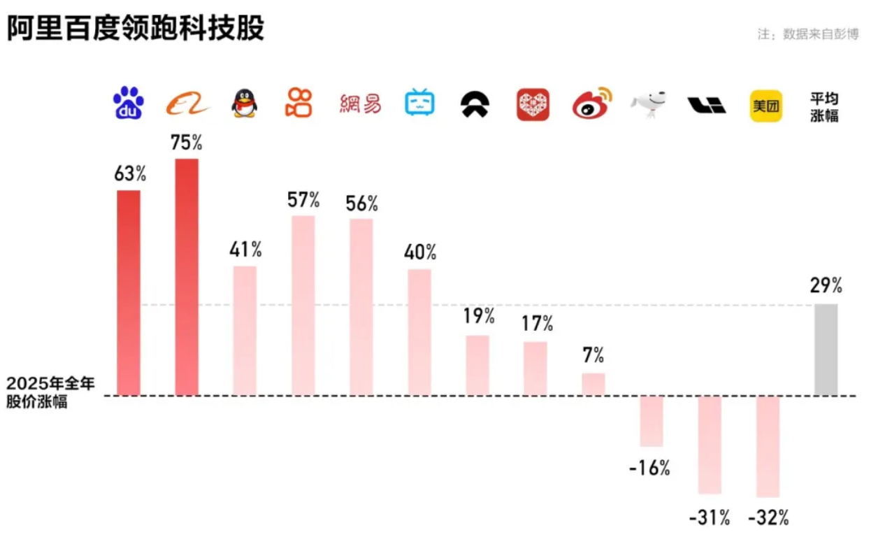 过去,百度很长时间里,不被外界真正理解,一度被误读为“起大早赶晚集”,但实际上,2025年百度股价全年涨幅63%,和阿里一起领涨中国科技股。