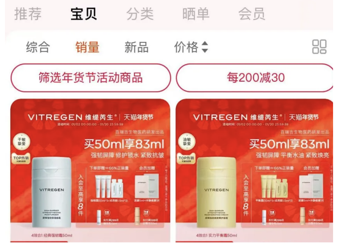 VITREGEN天猫旗舰店中,销量排名前几的品类均是面霜。其中,维缇芮生最“火”的产品是屏障强韧保湿面霜(适用于干皮),以及屏障强韧焕颜菁护面霜(适用于油皮)。