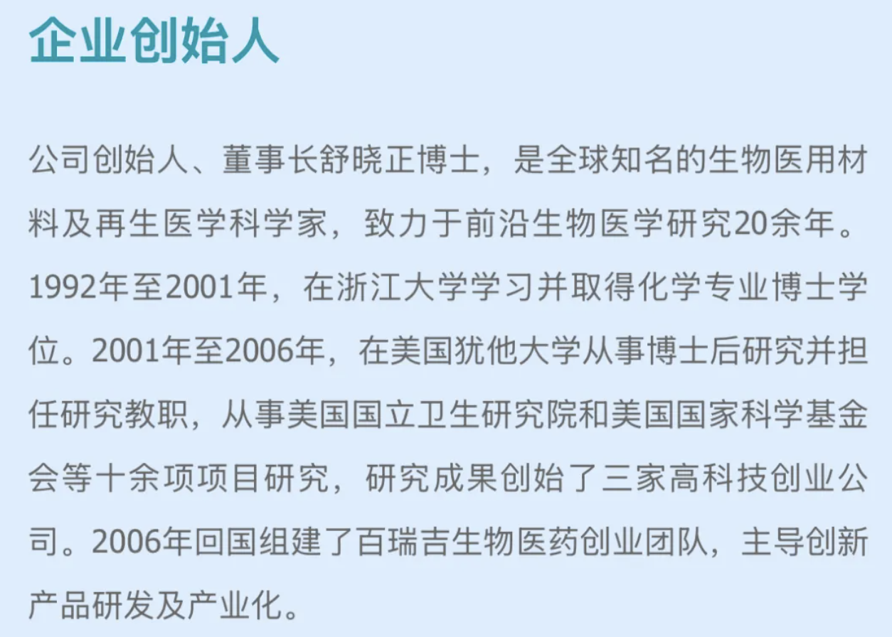 舒晓正出生于1974年。百瑞吉官网显示,在浙江大学获得化学专业博士后,2001年至2006年,舒晓正在美国犹他大学从事博士后研究并担任研究教职,并于2006年回国组建了百瑞吉生物医药创业团队,主导创新产品研发及产业化。