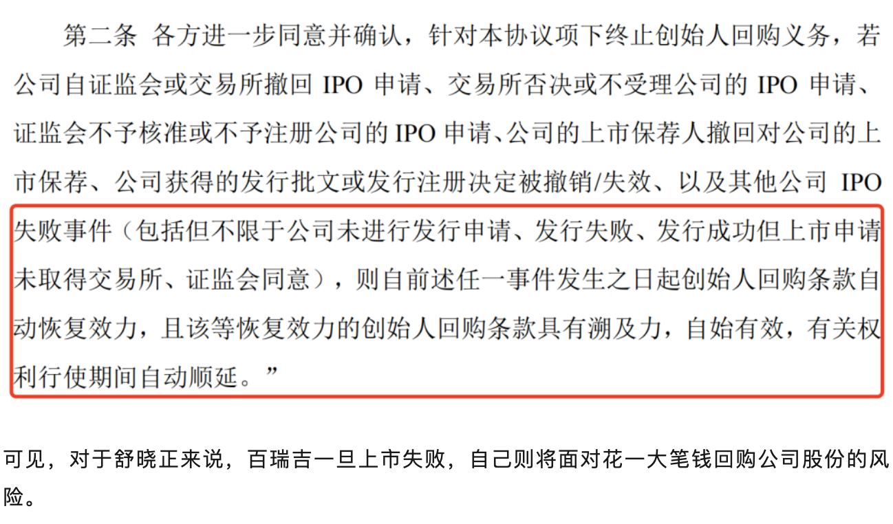 可见,对于舒晓正来说,百瑞吉一旦上市失败,自己则将面对花一大笔钱回购公司股份的风险。