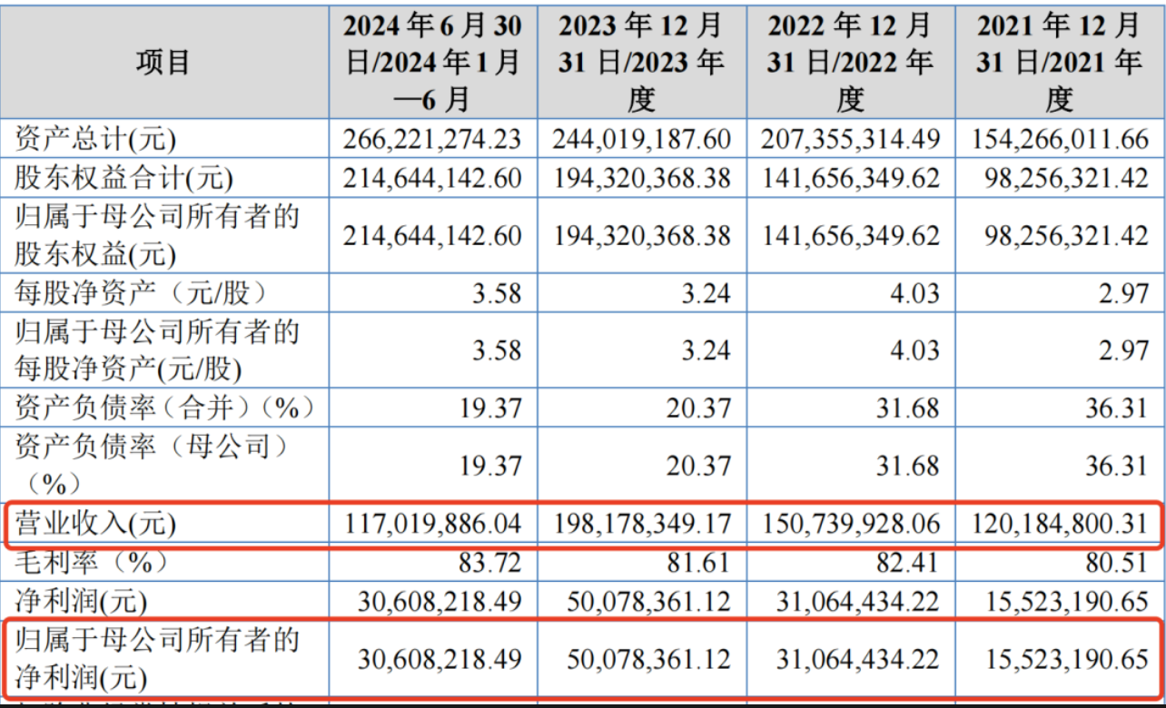 招股书显示,2021年-2024年上半年(以下简称“报告期”),百瑞吉的营业收入分别为1.20亿元、1.51亿元、1.98亿元和1.17亿元;同期净利润分别为1552.32万元、3106.44万元、5007.84万元和3060.82万元。