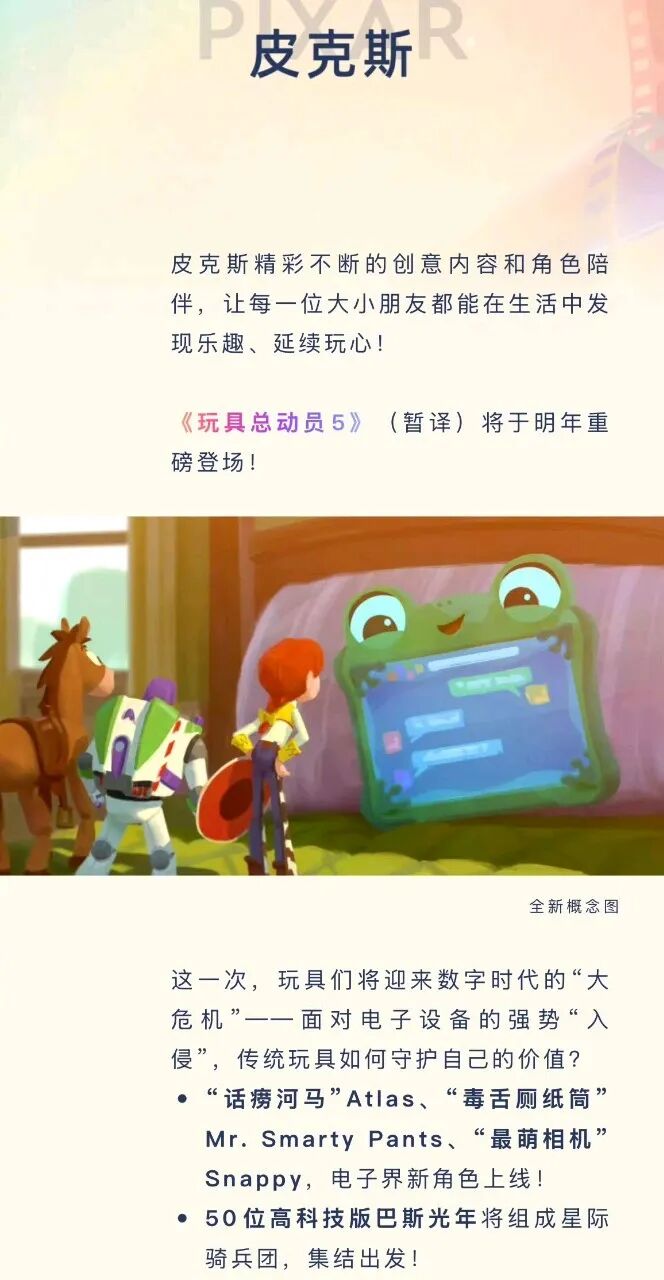 近日,迪士尼中国公布皮克斯动画电影《玩具总动员5》的官方概述:这一次,玩具们将迎来数字时代的“大危机”——面对电子设备的强势“入侵”,传统玩具如何守护自己的价值?