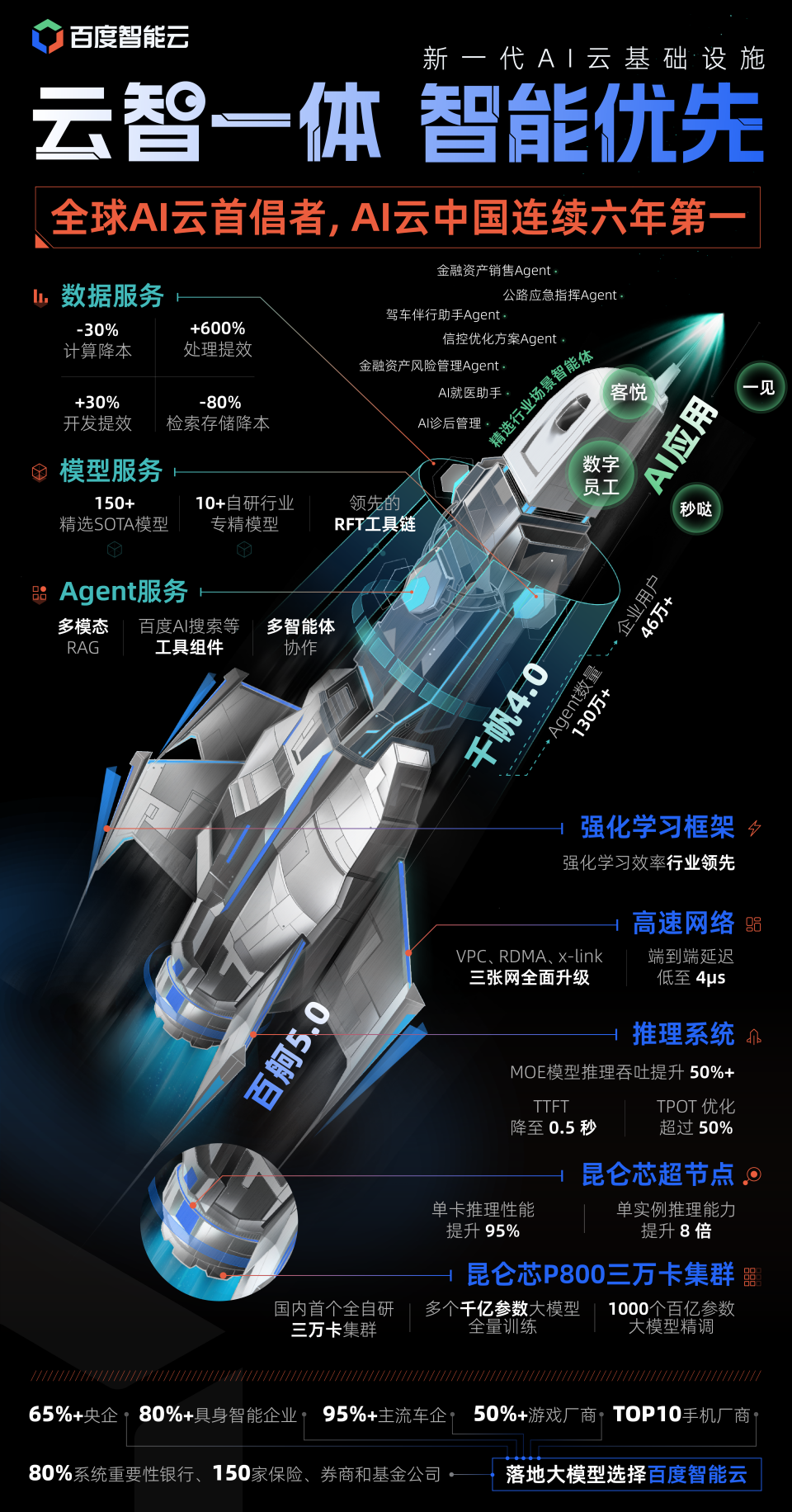 在全栈AI加持下,百度智能云已经支撑了一大批AI应用在产业场景中实现效果涌现。截至目前,超 65% 的央企、100%的系统重要性银行、95%的主流车企、50% 以上的游戏厂商以及重点的具身智能企业,在落地大模型时都选择了百度智能云。