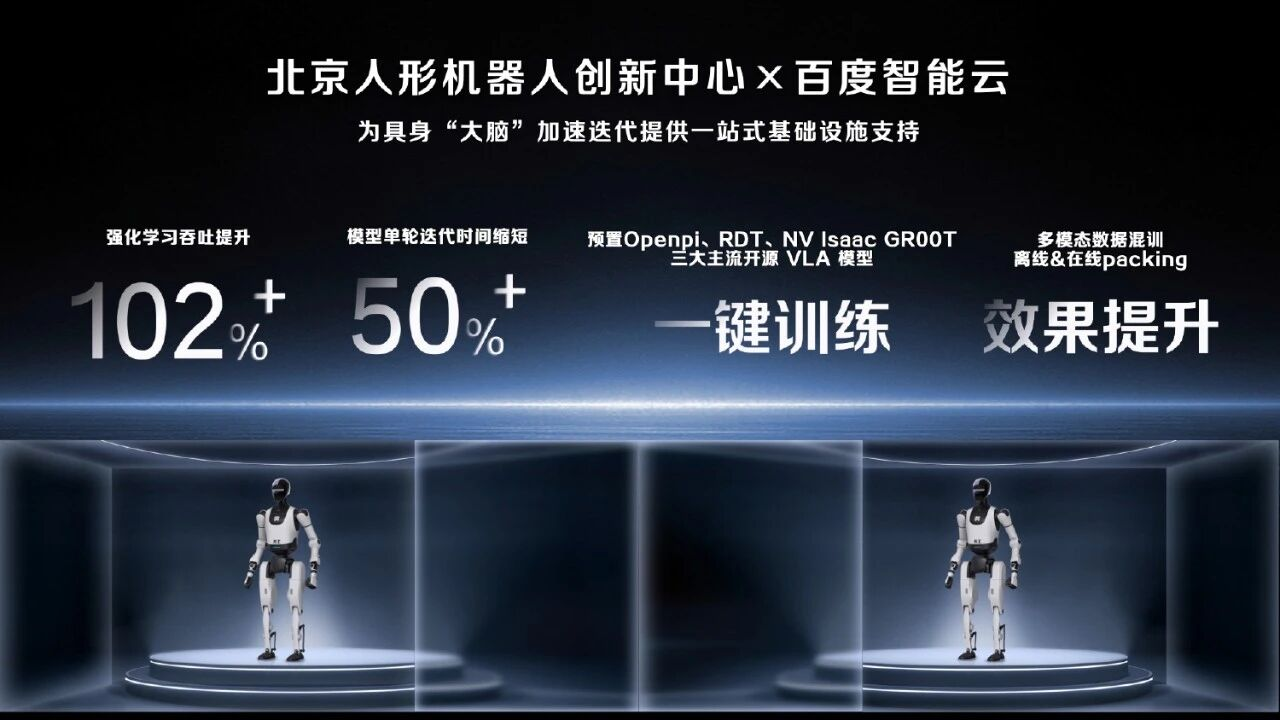 在具身智能行业,北京人形机器人创新中心近期发布的具身世界模型和跨本体 VLA 模型等前沿成果,其底层基础设施正是由百舸提供支撑,帮助其研发效率提升了 2 倍。