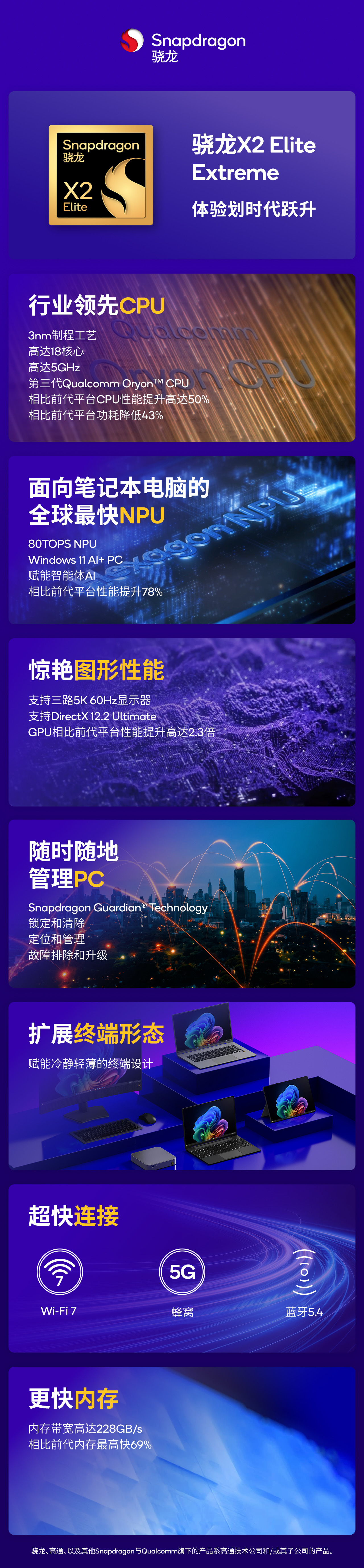 骁龙®X系列产品组合中的全新一代旗舰平台集成面向笔记本电脑的全球最快NPU,提供高达80TOPS的AI处理能力,并拥有行业领先的CPU性能。