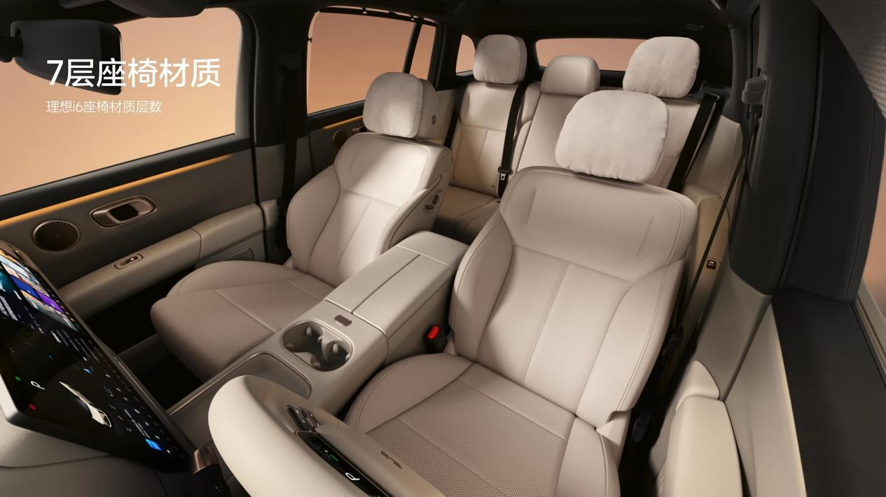 理想i6车长宽高4950x1935x1655毫米,轴距3000毫米,通过低重心和短前后悬设计,打造超过3.3米超大车内纵向可用空间。理想i6拥有同级领先的座椅舒适性,全车采用七层材质座椅,标配四座通风、五座加热和前排十点按摩,后排右侧配备皇后座椅。