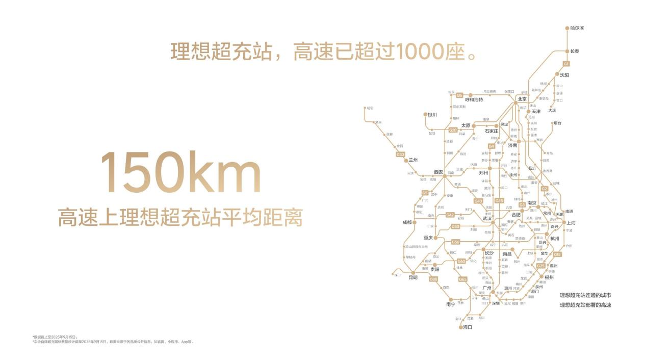为了让“5C速度”真正解决纯电用户的里程焦虑,理想汽车自建了规模大、覆盖广、使用体验好的超充网络。截至9月26日,理想汽车已上线超过3300座超充站和超过18,000根超充桩。理想汽车拥有全国最大规模的车企高速超充网络,超过1000座高速超充站覆盖全国最繁忙的“九纵九横”高速公路核心路段,平均间隔150公里。理想城市超充站总数突破2200座,总覆盖城市数量达到267个,并在一二线城市建成“10分钟充电生活圈”。基于智能规划、即插即充、预冷预热、无感支付等车桩网协同能力,以及充电功率按需分配策略,理想超充网络能够充分发挥纯电产品的5C优势,为纯电用户提供更便捷的充电体验。