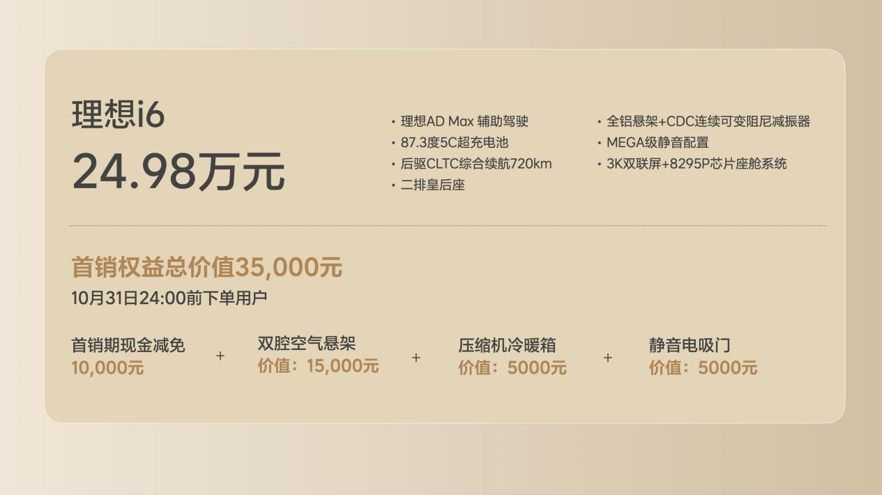 即日起,理想i6可以通过理想汽车官网或理想汽车App进行订购。2025年10月31日24:00前确认订购的理想i6用户,将享受10,000元的现金减免权益,以及双腔魔毯空气悬架、智能冷暖双用冰箱、全车静音电吸门的免费赠送权益,限时首销权益可与其他权益叠加使用。