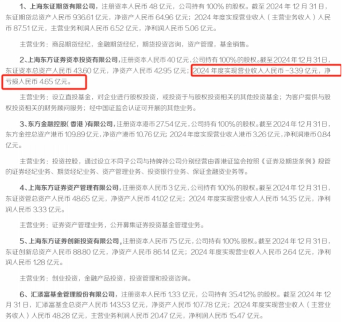 东方证券主要参控股公司里,东证资本是唯一亏损的(来源:东方证券24年报)