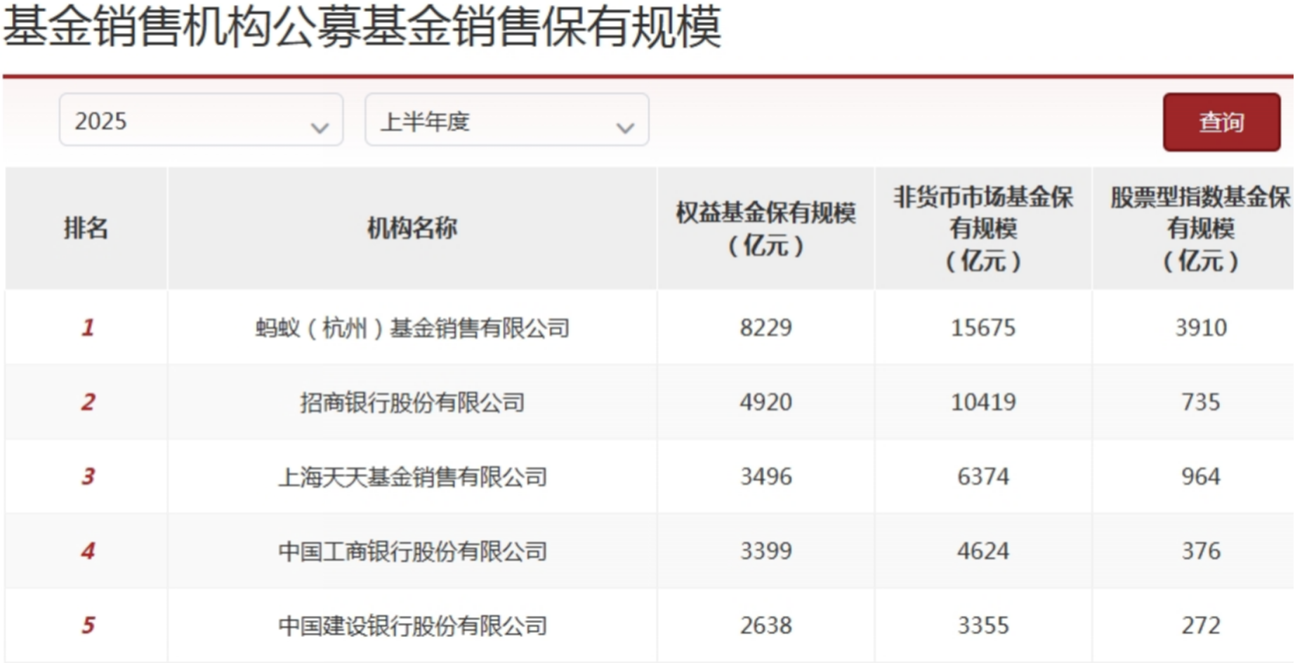 但招商银行逐渐被蚂蚁超越。最新数据是2025年上半年,蚂蚁基金以8229亿元的权益基金保有规模遥遥领先,招商银行以4920亿元的规模屈居次席;同样是互联网背景的天天基金以3496亿元的权益基金保有规模排第三。