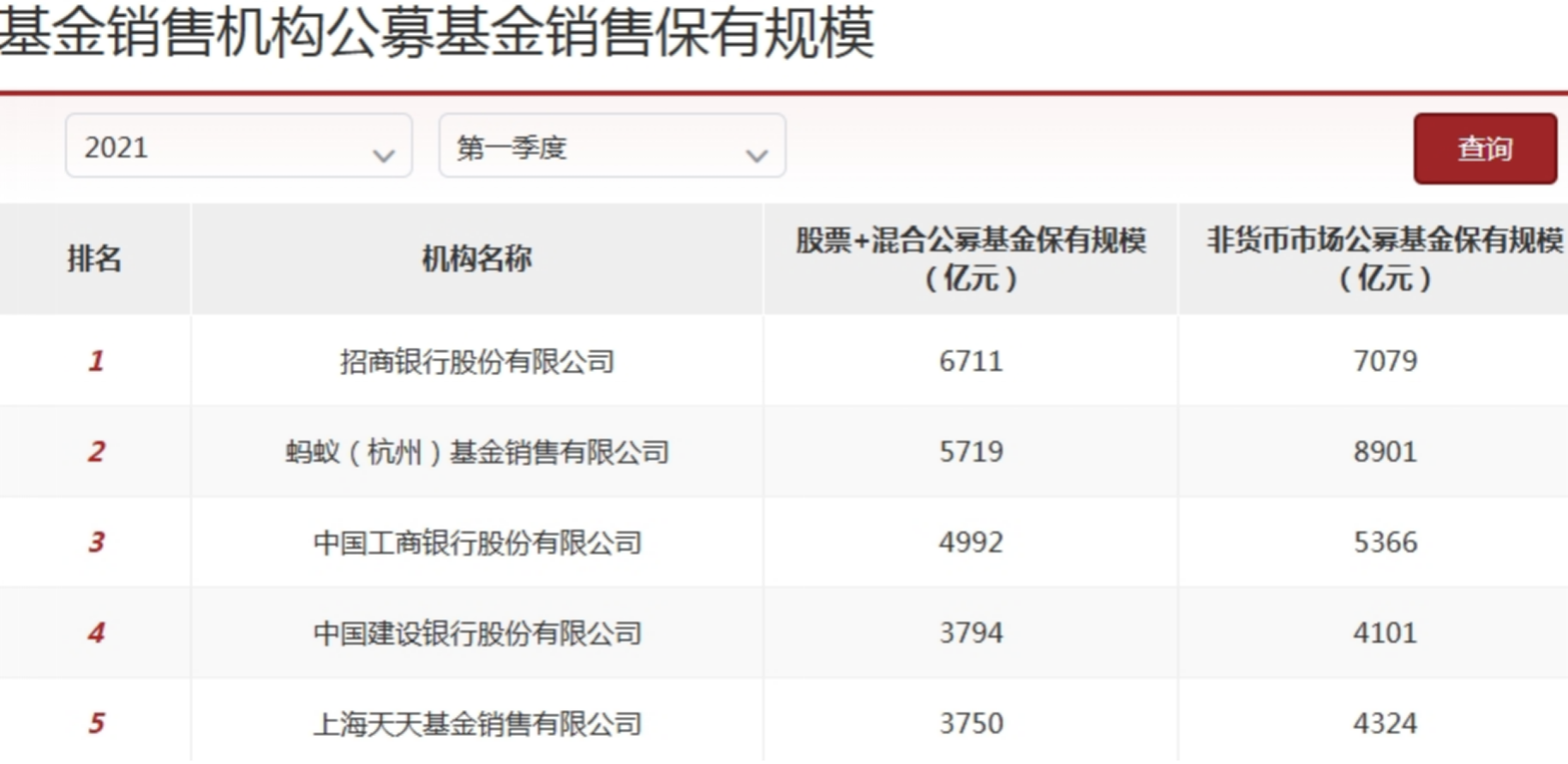 但近些年逐渐失色。证券基金业协会2021年开始披露公募基金销售数据。2021年一季度,招商银行的股票+混合公募基金保有规模达6711亿元,高居行业第一;蚂蚁集团旗下的蚂蚁(杭州)基金销售有限公司以5719亿元的股票+混合公募基金保有规模位居第二。工商银行排第三。东方财富旗下天天基金以3750亿元的规模排第5。