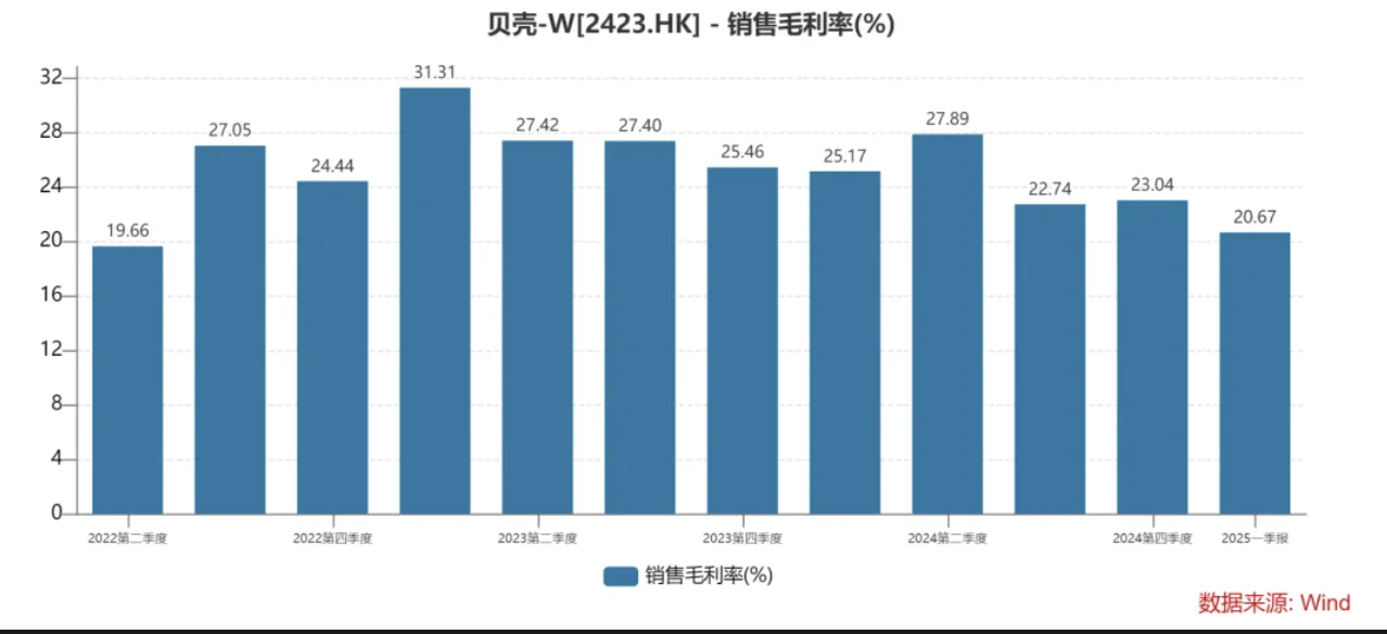 2025年第一季度,贝壳的毛利率降至20.7%,环比下降近3个百分点,同比下降近5个百分点,创下过去11个季度以来的最低点。