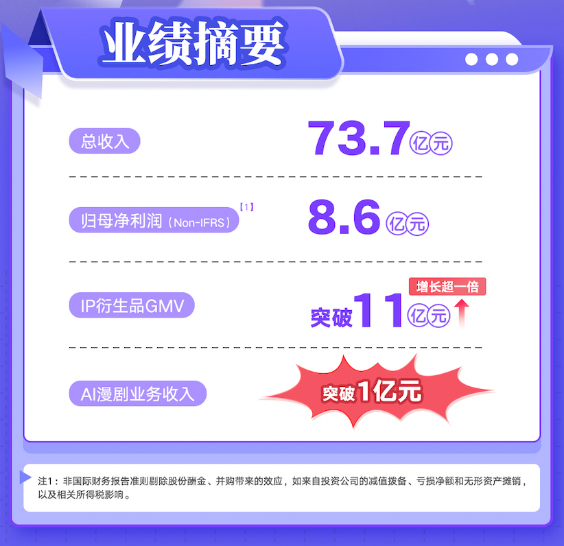 3月17日,阅文集团(股票代码:00772.HK)发布2025年全年财报。数据显示,2025年阅文实现营业收入73.7亿元,Non-IFRS归母净利润8.6亿元。在“IP+AI”战略指引下,阅文的AI漫剧、短剧、IP衍生品等新业态实现多元突破,其中AI漫剧收入呈爆发式增长,突破亿元大关;IP衍生品GMV同比增长超一倍,突破11亿元。