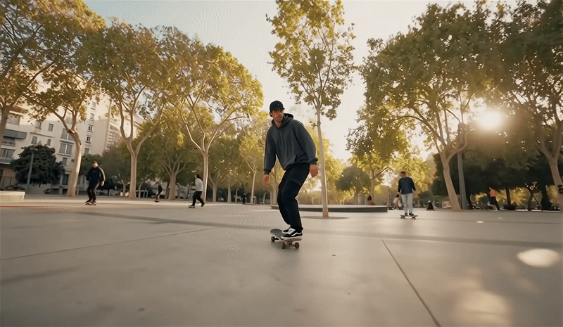 例如,输入Prompt:仰视角度拍摄,全景,日光,晴天光,侧光,暖色调,中心构图。一名外国男子在城市公园的水泥广场上玩滑板,他约二十多岁,身材健硕,深色短发藏在黑色棒球帽下,身穿深灰色连帽上衣和黑色工装裤,脚踩一双黑白拼色运动鞋。镜头从低角度仰拍,突出其腾空动作的张力。他站在滑板上加速前行,身体前倾,双臂自然张开以维持平衡;随后猛然跃起,右脚轻踢板尾,滑板在空中完成180度翻转,他迅速下压接住滑板,双脚精准落回板面,稳稳着地后继续向前滑行。背景中,三两名滑板者在远处滑行穿梭,梧桐树叶在微风中轻轻摇曳,阳光穿过树叶间隙洒下斑驳光影,投射在地面和滑板轮迹上。伴随着节奏鲜明的都市电子音乐,背景传来轮子摩擦地面的沙沙声与远处隐约的交谈声。男子落地瞬间轻哼一声“Yeah!”,语气轻快自信。