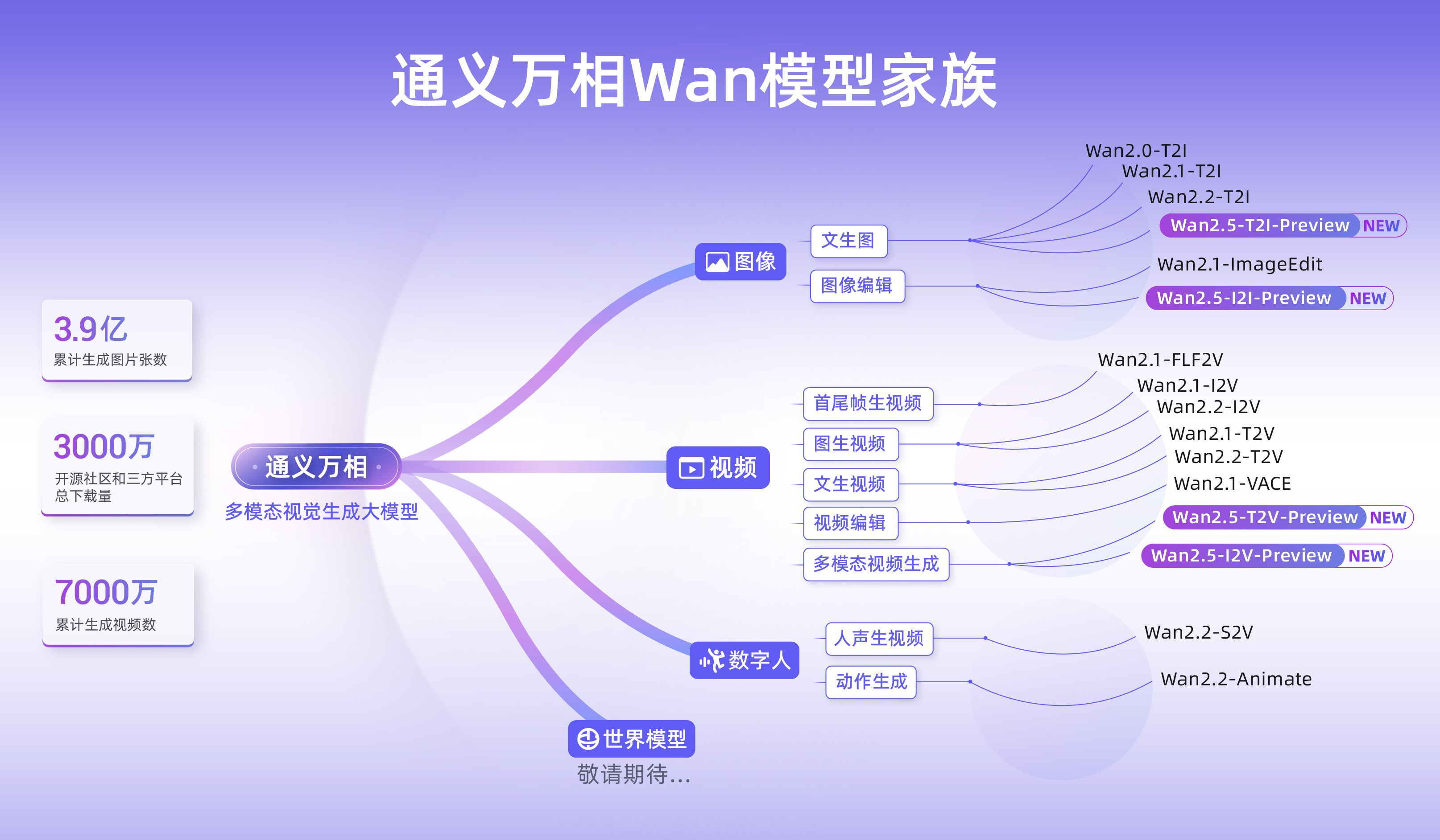 摘要:发布通义万相Wan2.5 preview系列模型,涵盖文生视频、图生视频、文生图和图像编辑四大模型